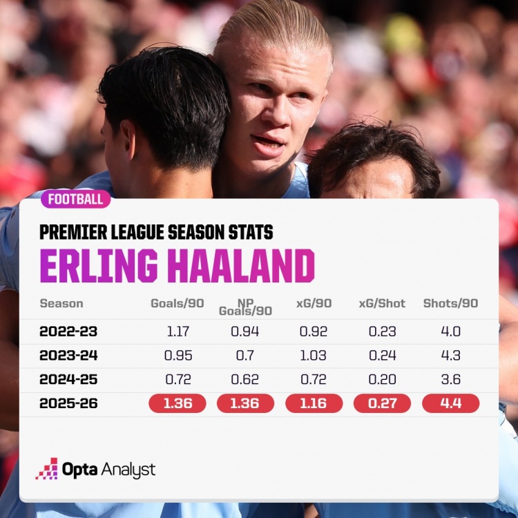 哈兰德本赛季每90分钟射球 4.4次、进1.36球,均创英超生涯新高
