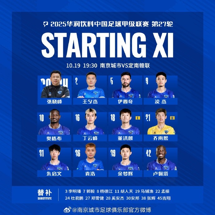 中甲第27轮,南京城市vs定南赣联杆位名单出炉,让我们并肩战斗!