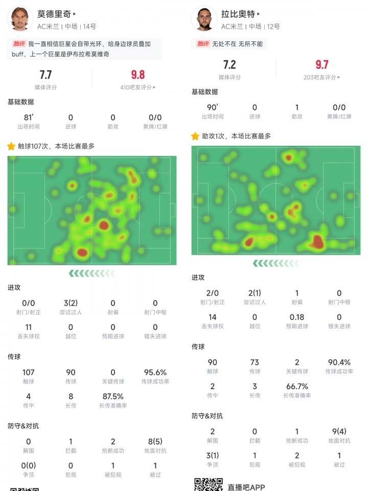 本场比赛米兰中场双核拉比奥特和莫德里奇表现出色,拉比奥特全场完成90次触球,73次传球并送出1次助攻,传球成功率90.4%;莫德里奇更是完成了全场最高的107次触球,英超免费高清直播以高达95.6%的成功率送出了90次传球。