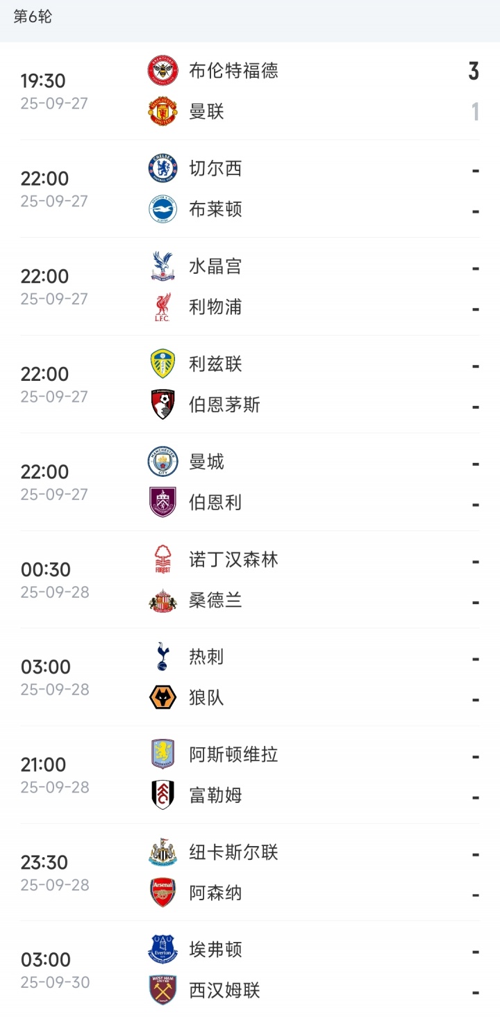 熟悉的位置!英超积分榜:曼联6轮7分英超第13,车军城今晚出战