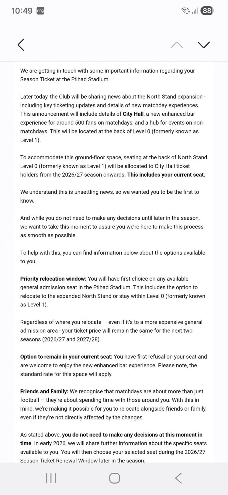该球迷:“这听起来非常令人沮丧和失望。持有季票长达44年,并且从第一天起就拥有同一个座位,这代表了极大的忠诚和投入。