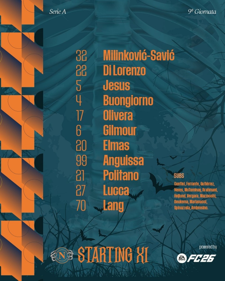 那不勒斯首发:32-瓦尼亚-米林科维奇-萨维奇、22-迪洛伦佐、5-胡安-热苏斯、4-布翁乔尔诺、17-马蒂亚斯-奥利维拉、6-吉尔莫、20-埃尔马斯、99-安古伊萨、21-波利塔诺、27-洛伦佐-卢卡、70-诺阿-朗