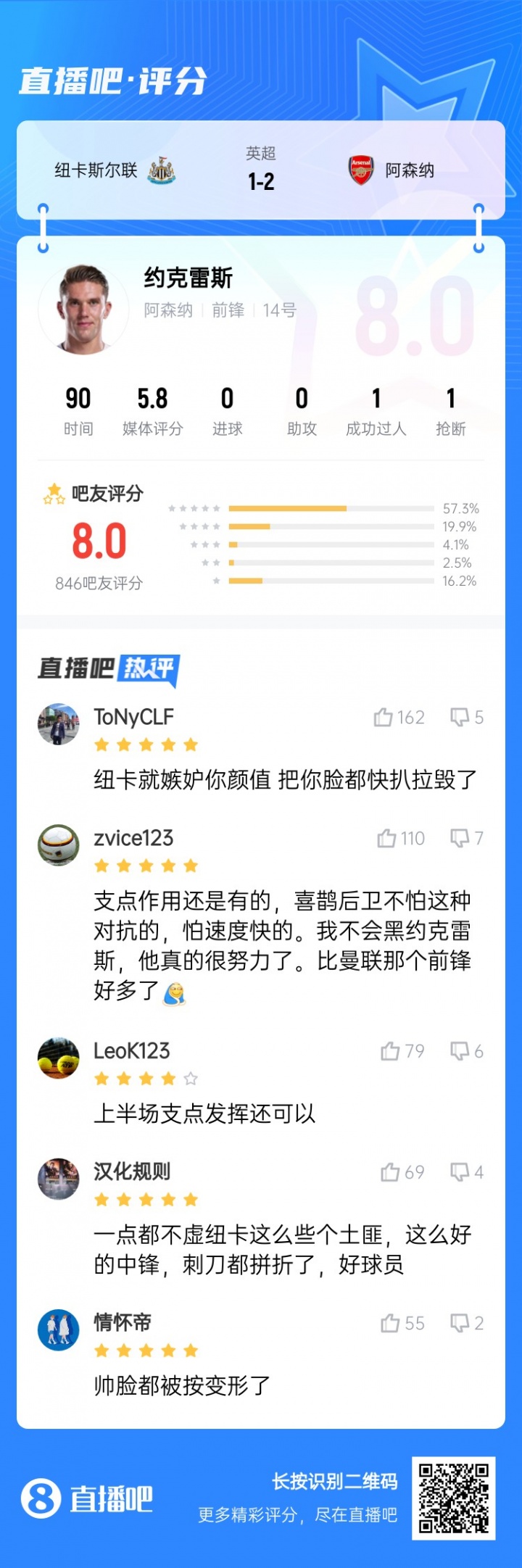纽卡嫉妒你的颜值😂约克雷斯0球0助球迷评8分:支点作用明显