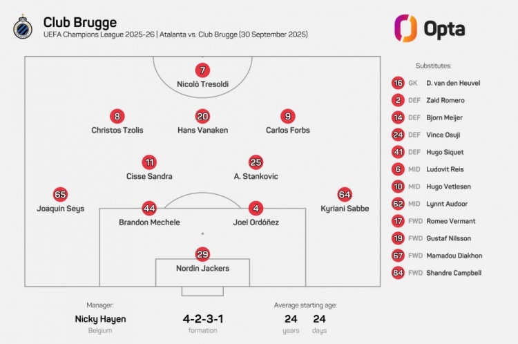 24岁24天!布鲁日排出欧冠历史平均年龄最年轻杆位阵形