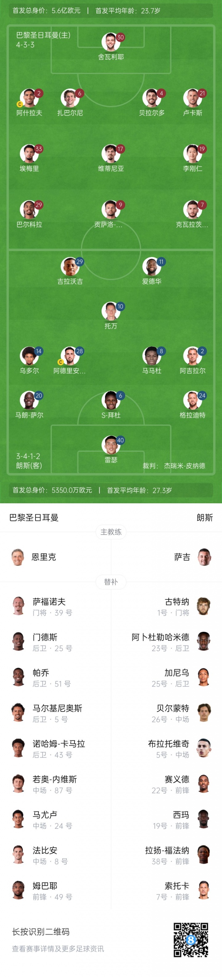 巴黎首发:30-舍瓦利耶、2-阿什拉夫、4-贝拉尔多、6-扎巴尔尼、21-卢卡斯-埃尔南德斯、17-维蒂尼亚、19-李刚仁、33-扎伊尔-埃梅里、7-克瓦拉茨赫利亚、9-贡萨洛-拉莫斯、29-巴尔科拉