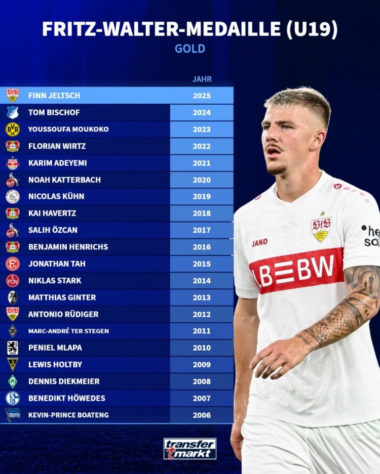 10月17日讯 斯图加特中卫耶尔奇当选德国足协年度最U19最佳新秀,英超免费高清直播德国转会市场列出了历届德国U19年度最佳新秀的名单。