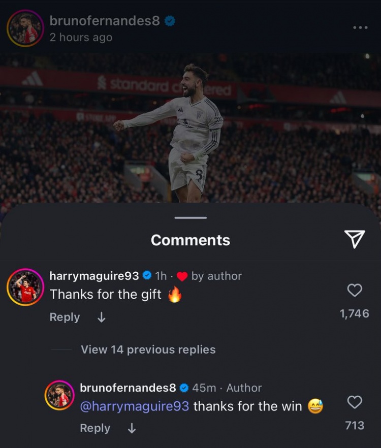 B费赛后社媒晒照庆祝获胜 ,马奎尔留言:“谢谢你的礼物。”