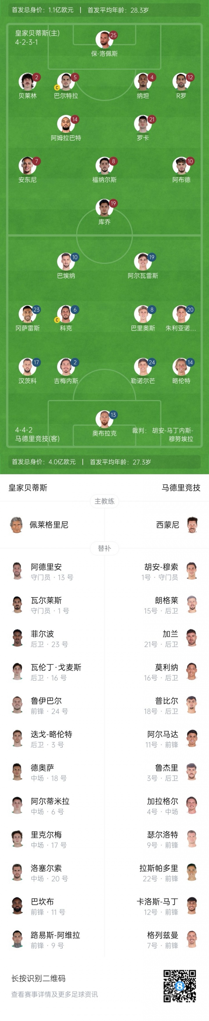 贝蒂斯vs马竞杆位:安东尼pk阿尔瓦雷斯,朱利亚诺·西蒙尼出战