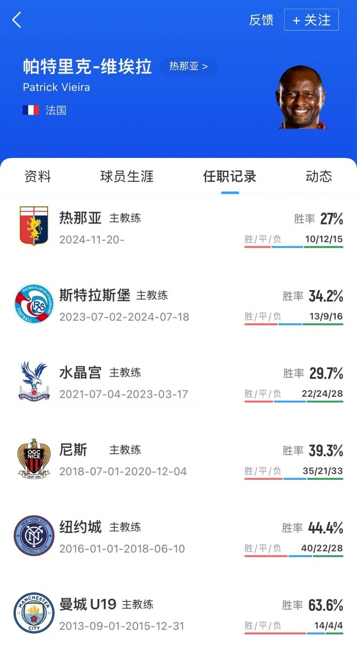 维埃拉自去年11月20日接手球运动 队以来,带队至今10胜12平15负,胜率仅27%。