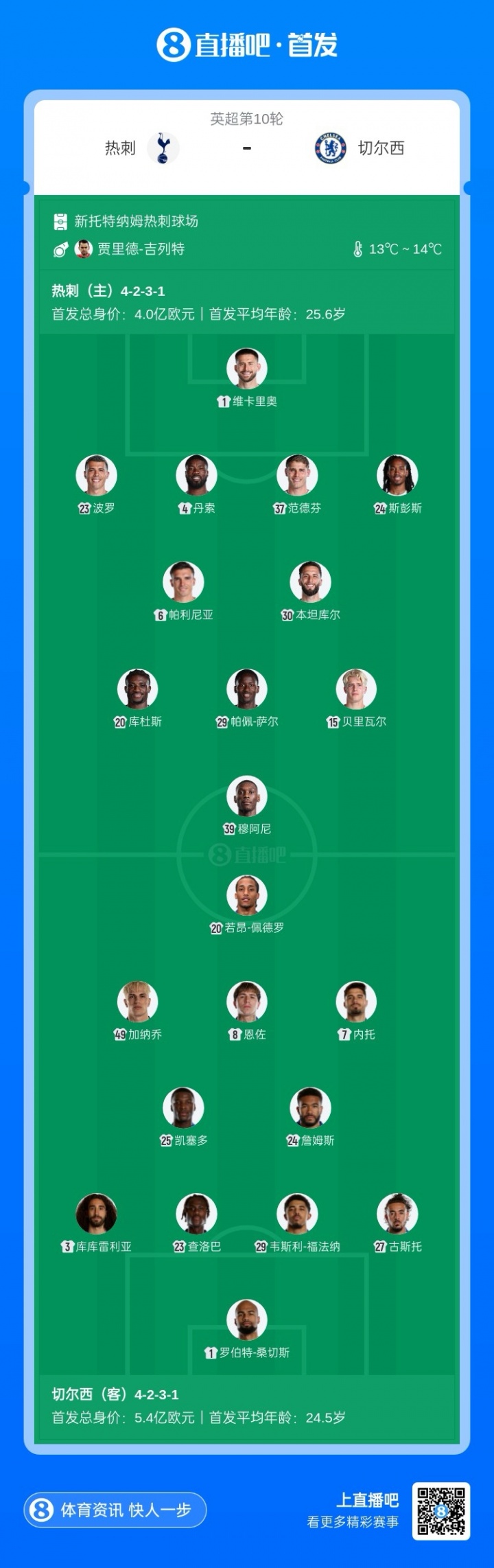 热刺vs切尔西杆位:穆阿尼pk佩德罗,加纳乔、恩佐、凯塞多出战