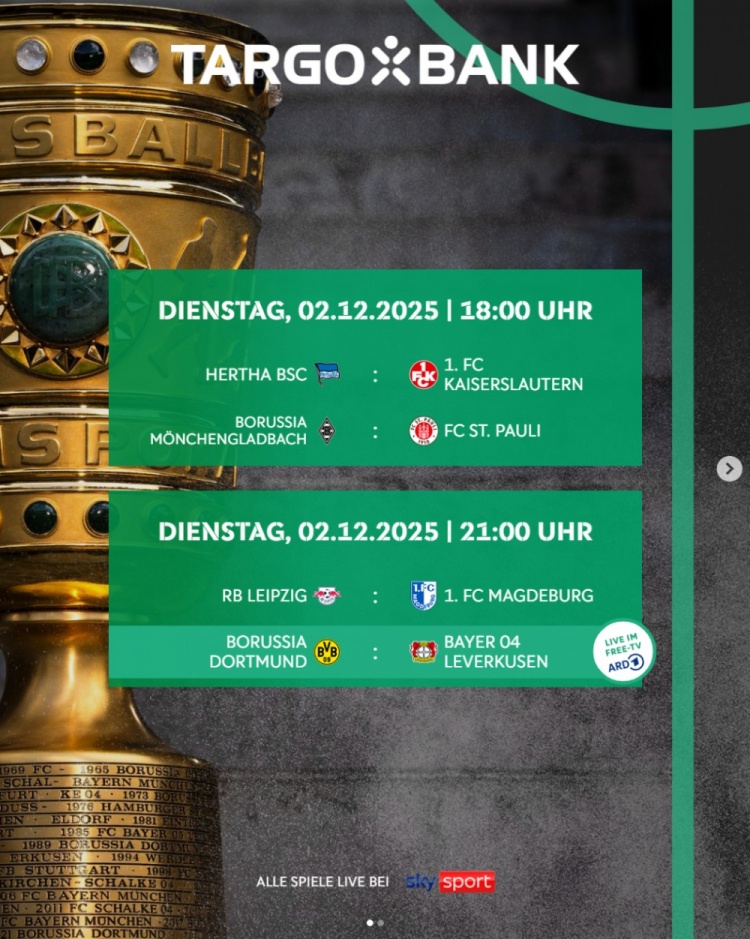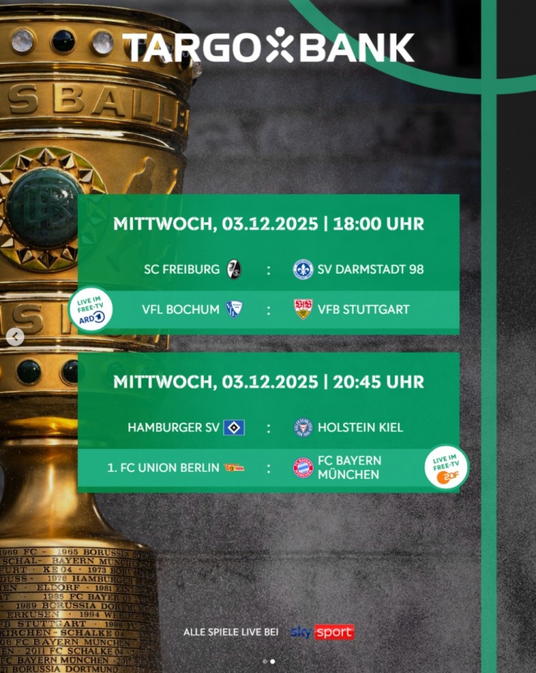 德国杯1/8决赛时间:12月3日4点药厂vs多特 4日3:45柏林联合拜仁