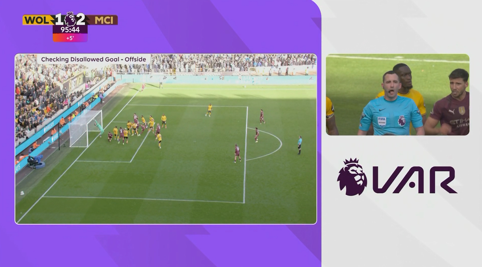 上赛季曼城2-1狼队,斯通斯补时绝杀,VAR介入判罚进球有效。