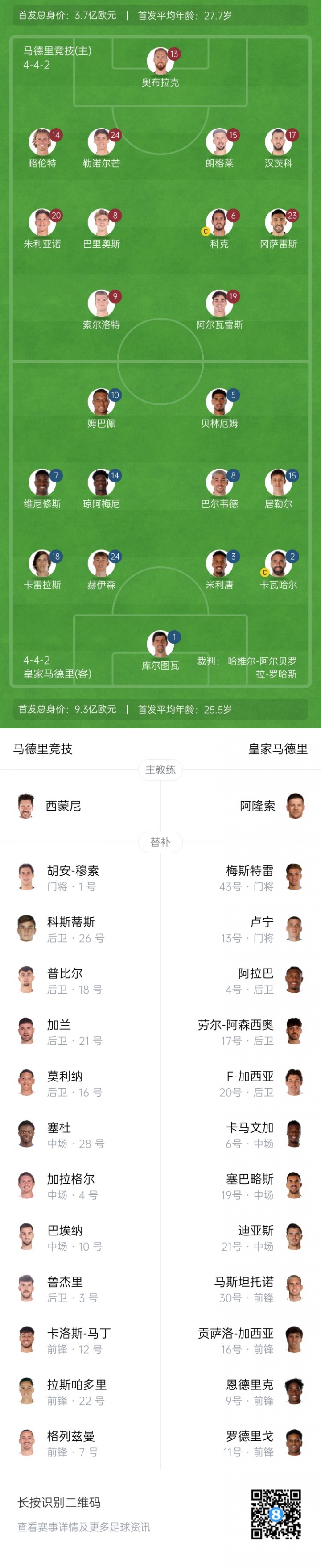 马竞vs皇马杆位:小蜘蛛PK姆巴佩!贝林、居勒尔出战,格子后备