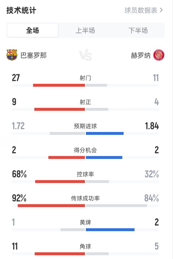 巴萨2-1赫罗纳全场数据:射门27-11,射正9-4,控球率68%-32%