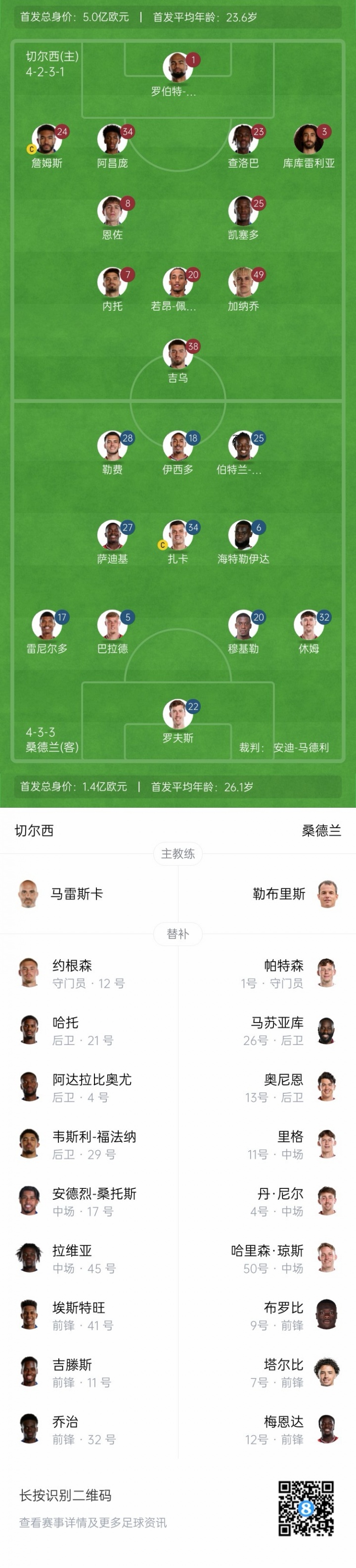 切尔西首发:1-桑切斯、24-詹姆斯、34-乔什·阿昌庞、23-查洛巴、3-库库雷利亚、25-凯塞多、8-恩佐、7-内托、20-若昂·佩德罗、49-加纳乔、38-吉乌