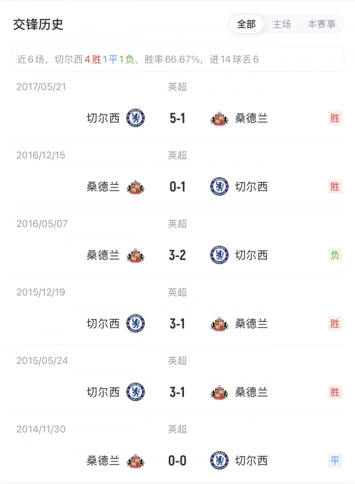 赛前切尔西8轮14分,落后第四利物浦1分,英超直播球队各项赛事取得4连胜。桑德兰8轮同样也拿到14个积分,球队近6轮3胜2平1负,唯一败仗是0-2曼联。