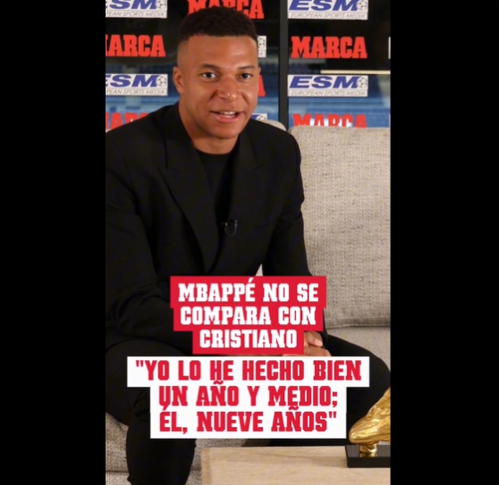 姆巴佩领取上赛季欧洲金靴,他接受《马卡报》专访,谈到与C罗的比较。