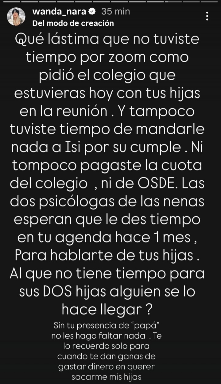 伊卡尔迪前妻旺达·娜拉连续更新两条社媒社媒,批评伊卡尔迪对待孩子的行为。
