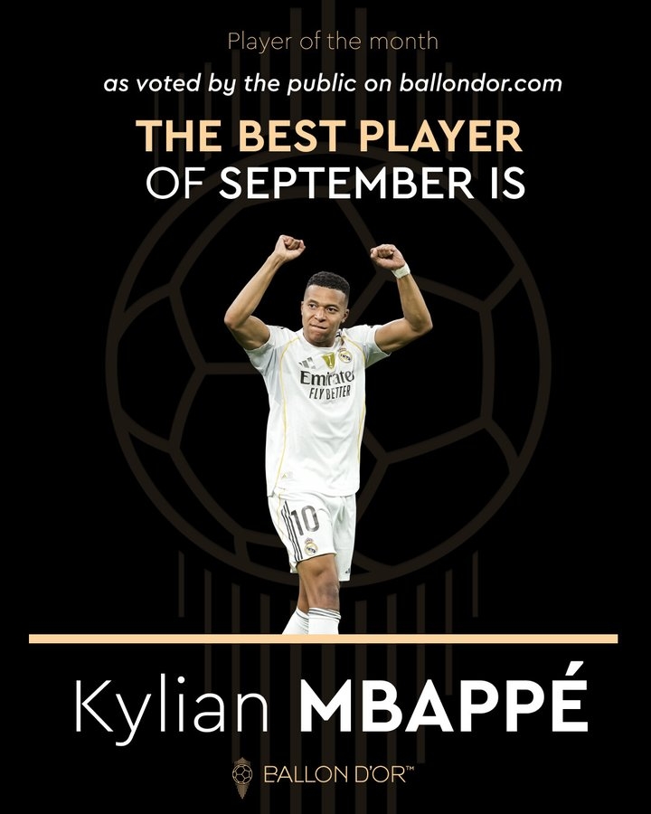 金球奖官方消息,姆巴佩当选金球奖9月份最佳球员。