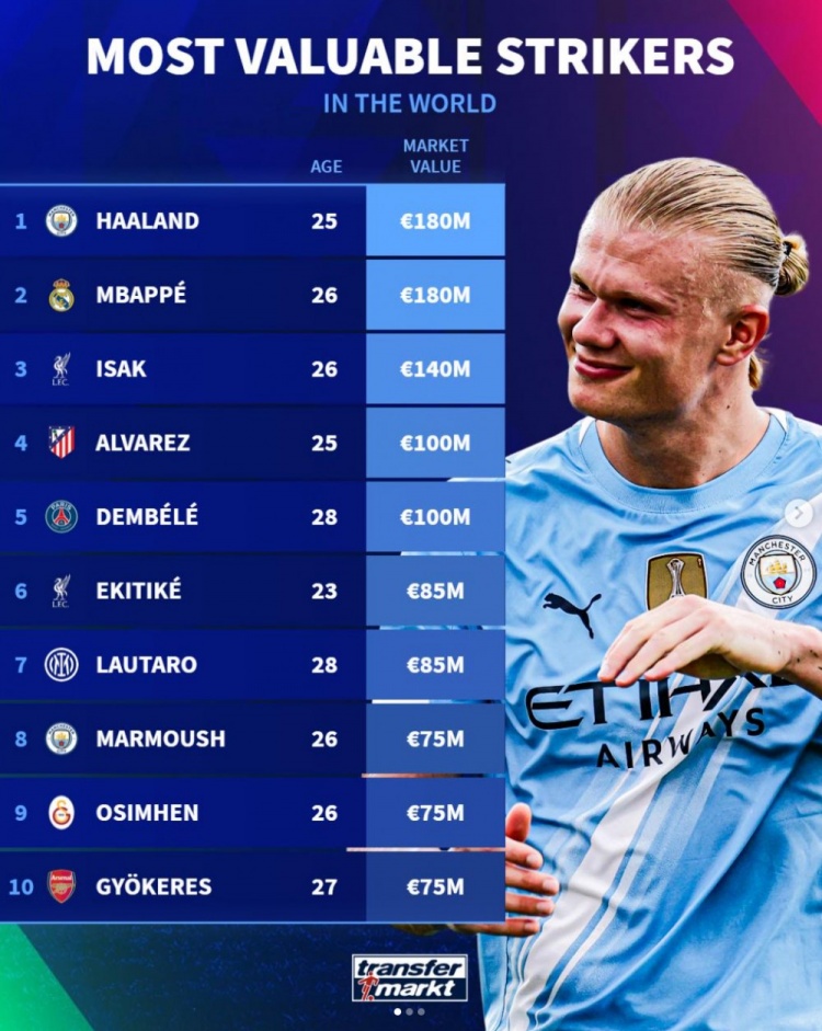 11月3日讯 德转列当前世界足坛五号位身价排行,哈兰德、姆巴佩1.8亿欧并列最高,英超直播在线高清(无插件)伊萨克1.4亿欧,阿尔瓦雷斯、登贝莱1亿欧。