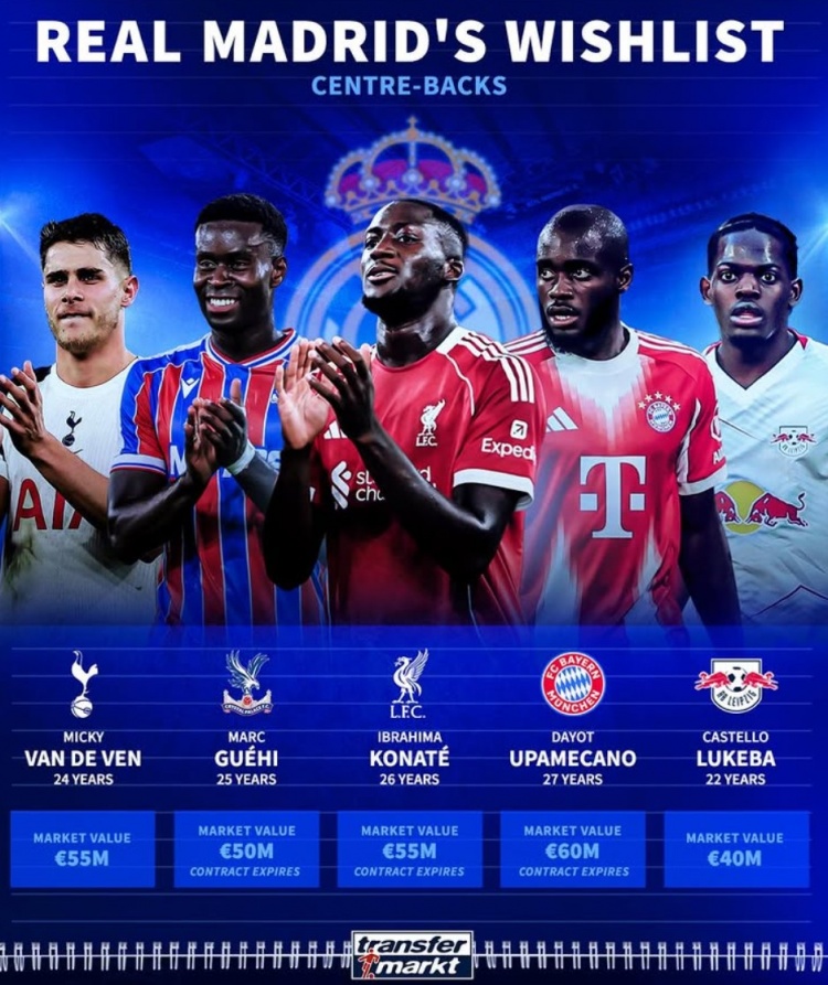 选谁?德转列皇马5大中卫目标:科纳特、于帕、格伊3人合同将到期