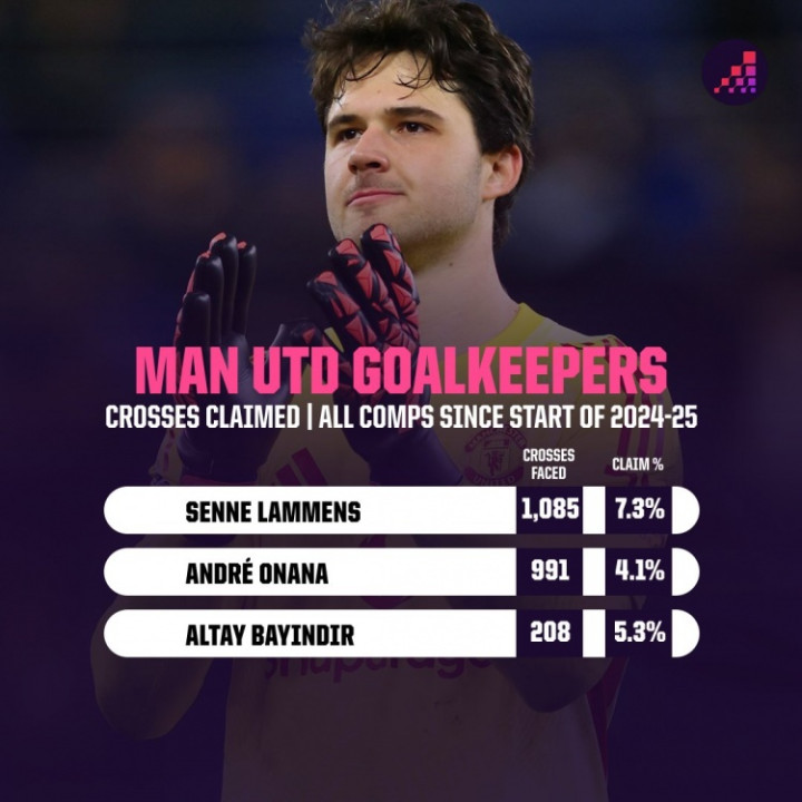 2024-25赛季以来,拉门斯共1085次面对传中球,他摘传中球成功率为7.3%;奥纳纳991次面对传中球,摘传中球成功率为4.1%;而巴延德尔则是208次面对传中球,摘传中球成功率为5.3%。