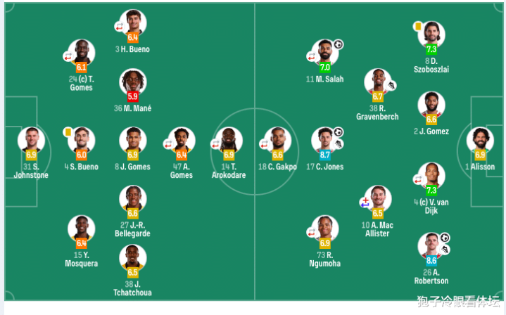利物浦杆位:1-阿利松、26-罗伯逊、2-戈麦斯、4-范戴克(80’5-科纳特)、38-赫拉芬贝赫、10-麦卡利斯特(81’42-尼奥尼)、17-琼斯、8-索博斯洛伊、11-萨拉赫(65’30-弗林蓬)、73-恩古莫哈(65’7-维尔茨)、18-加克波(86’68-莫里森)。