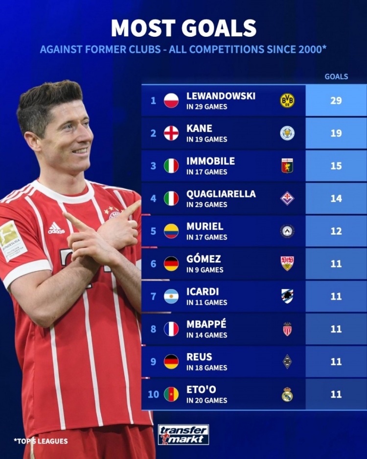 本世纪五大联赛对老东家进球榜:莱万29球居首,凯恩19球次席