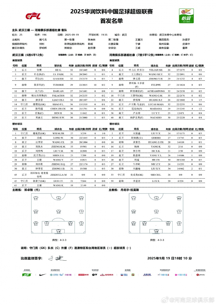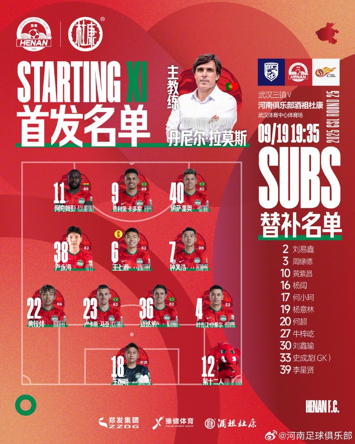 武汉三镇VS河南俱乐部酒祖杜康 首发及替补队员名单