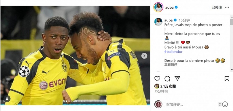 奥巴梅扬社媒晒出与登贝莱效力多特、巴萨时期的多张合照,配文:“兄弟,英超免费高清直播我有太多照片要发了!感谢你成为现在的自己🙏🏽实至名归❤️🤝🏽也恭喜你,穆斯 (登贝莱好友)🤲🏽抱歉发了最后一张照片🤣🤣”
