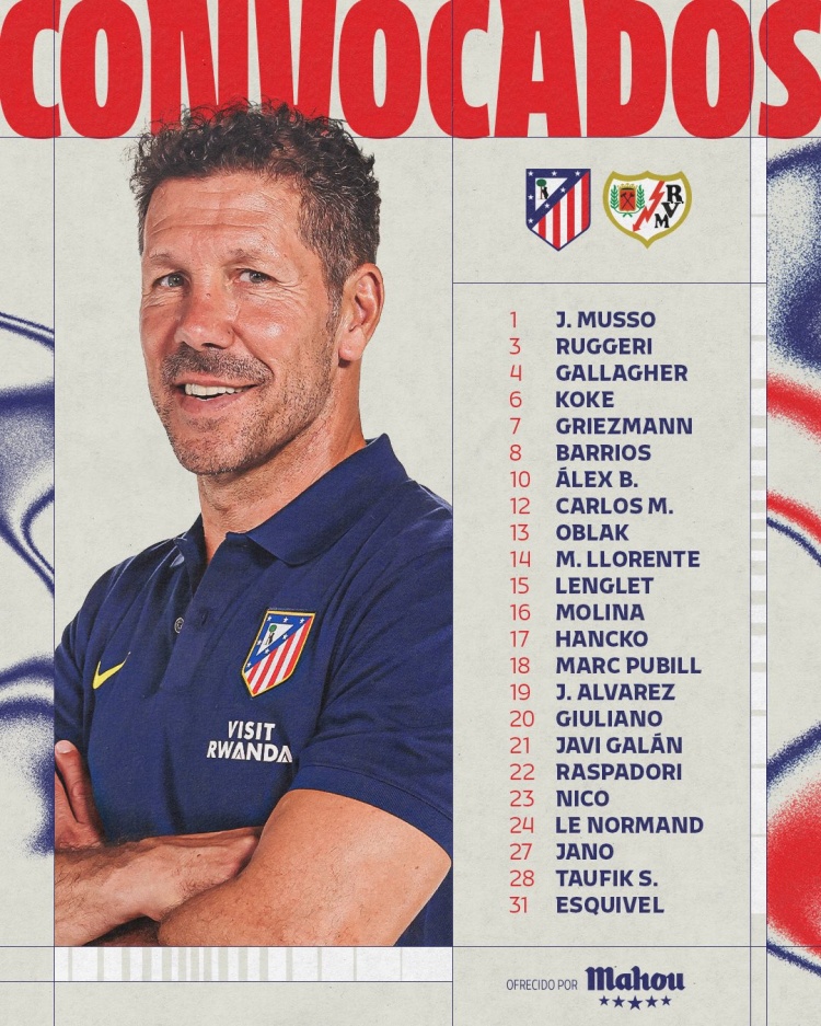 马竞对阵巴列卡诺名单:阿尔瓦雷斯、格列兹曼在列,巴埃纳回归