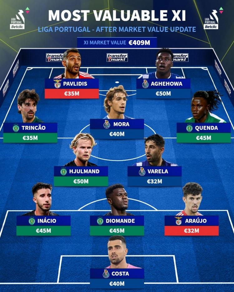 德转列葡超最贵身价阵容:三巨头包圆,葡萄牙体育5人入选最多
