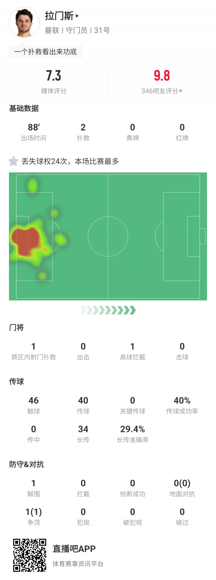 真稳啊!拉门斯曼联首秀零封获吧友9.8高分,扑救+摘高球样样都有