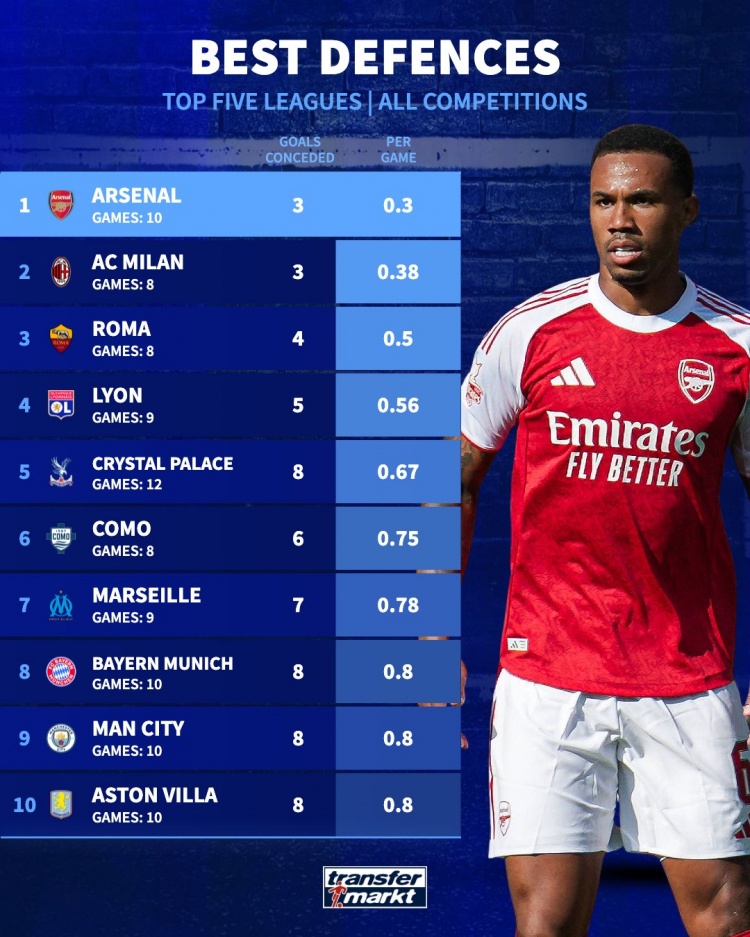 五大联赛球队场均失球最少榜:阿森纳0.3球居首,米兰、罗马前三