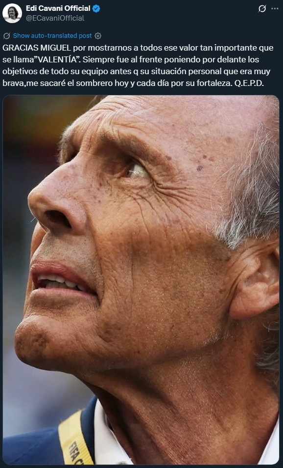 10月9日讯 卡瓦尼在推特发文,悼念离世的博卡青年主帅米格尔-安赫尔-鲁索。