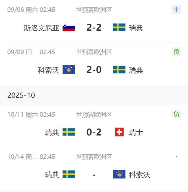 10月11日讯 世预赛欧洲区小组赛B组第3轮,瑞典主场0-2不敌瑞士,遭遇三场不胜,目前小组垫底,出线告急。